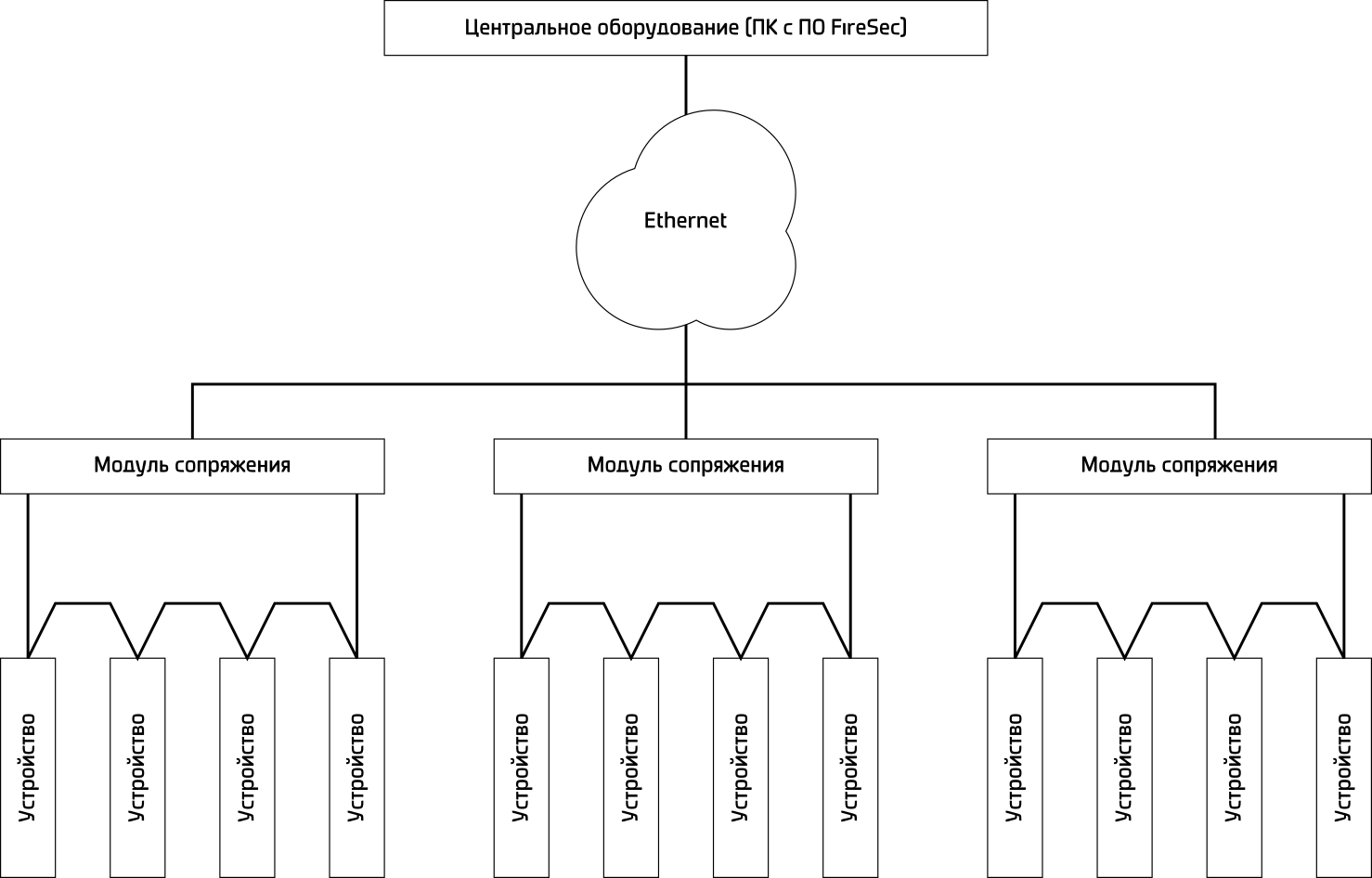 Система состоит из трёх уровней: периферийные устройства (адресные метки, извещатели, оповещатели, хлопушки дымоудаления и др.), модули сопряжения и центральное оборудование в виде ПК с установленным ПО FireSec.