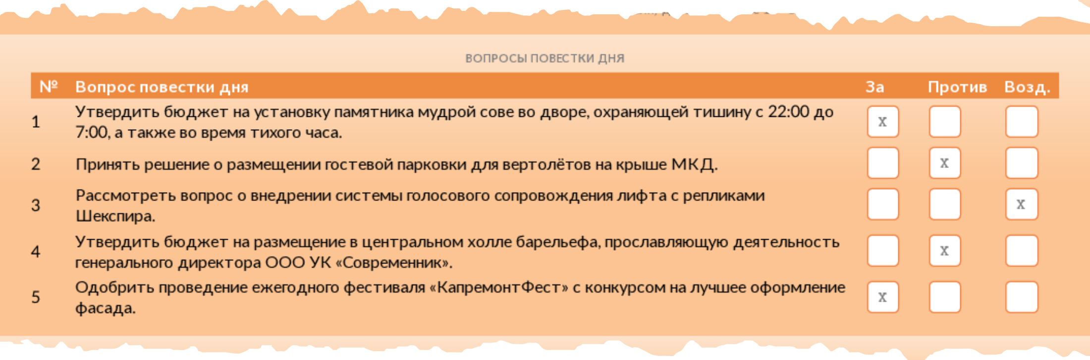 Допустимые варианты ответов: «за», «против», «воздержался».