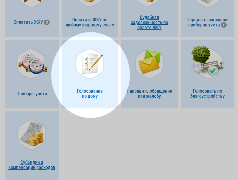 Перейдите в раздел голосования. На главной странице найдите пункт меню «Голосование по дому».