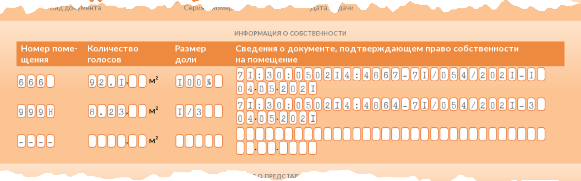 Если голосует представитель по доверенности, он указывает данные самого собственника, а не свои.