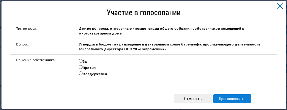 Проголосуйте. Нажмите на кнопку «Проголосовать» в списке вопросов, и в открывшейся форме установите переключатель в поле с необходимым ответом («За», «Против», «Воздержался») в поле «Решение собственника», затем нажмите «Проголосовать».