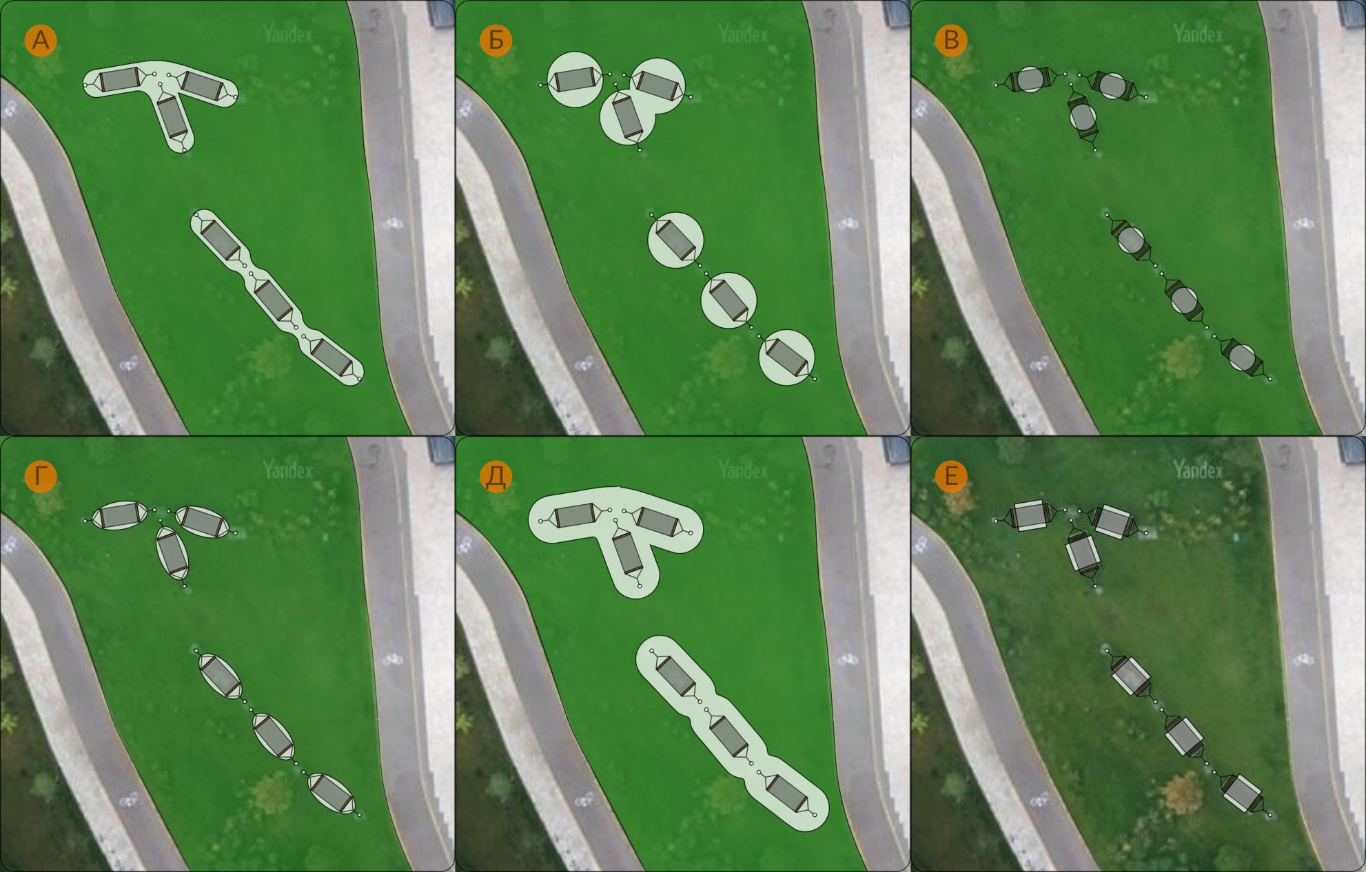 Для удобства варианты типов покрытия обозначены арабскими цифрами, а варианты формы границ покрытия -- русскими буквами.